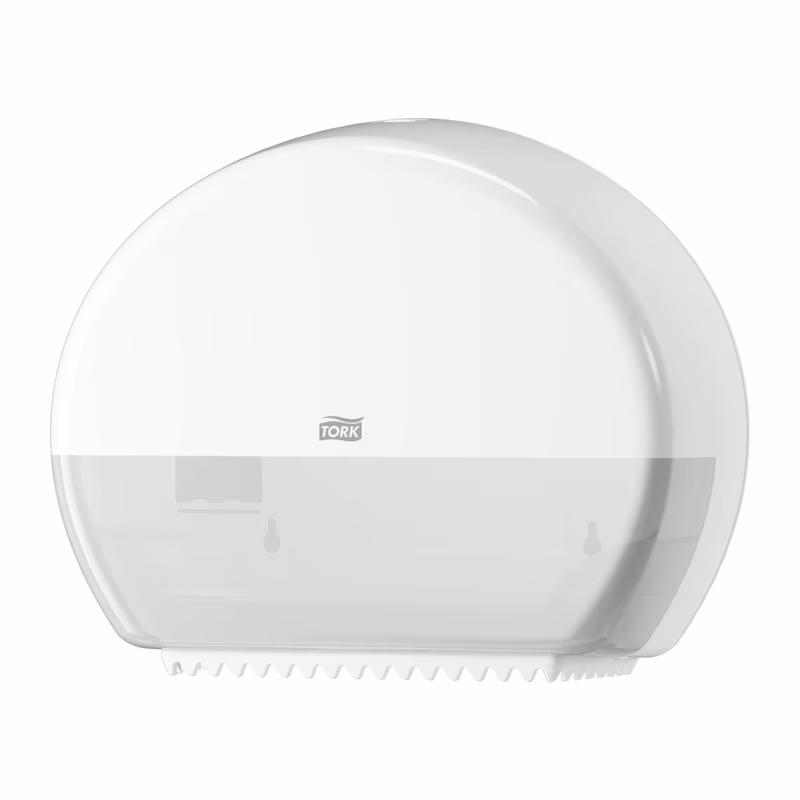 The Tork Mini Jumbo Toilet Roll Dispenser in Elevation Design is ideal for medium to high-traffic washrooms where time efficiency and reduced cost are important. The high capacity saves maintenance time and ensures that paper is always available. The Tork Elevation dispensers have a seamless, functional, modern design, that makes a lasting impression on your guests.