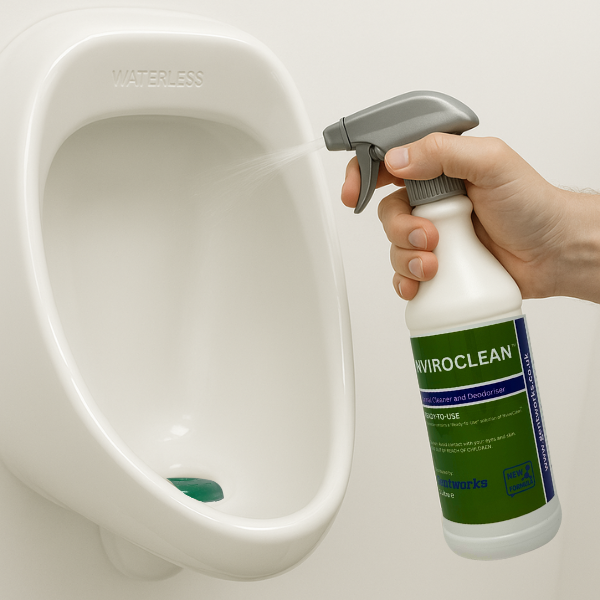 Nviroclean has been specifically designed for use with waterless urinals. Upon contact, this cleaner is activated to breakdown residual urine and other organic matter. By using this product, the cleaning process is reduced to a simple spray and walk away! Nviroclean will leave behind a clean, shiny, deodorised urinal. Prolonged use may assist in the reduction of build-up in the trap or waterless cartridge, therefore increasing longevity. Waste pipes will also benefit because prolonged use may assist in the reduction of build-up and help prevent blockages.